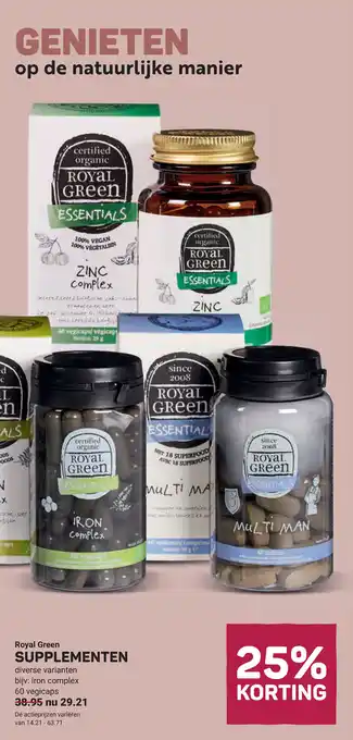 Geniet van de natuurlijke manier van supplementen met de certified organic Royal Green Iron Complex. Deze 100% vegan supplementen zijn essentieel voor een gezonde levensstijl. Royal Green is een betrouwbaar merk sinds 2008, met diverse varianten zoals Zinc Complex en Multi Man. De Iron Complex variant bevat 18 superfoods en is perfect voor mannen. Profiteer nu van de actieprijs met 25% korting en ervaar de voordelen van Royal Green supplementen. Bestel vandaag nog en geef je lichaam de essentiële voedingsstoffen die het nodig heeft. Royal Green, voor een gezond en energiek leven op een natuurlijke manier.