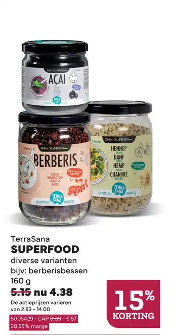 Ontdek de diverse varianten van TerraSana Superfood, waaronder de heerlijke berberisbessen van 160 g. Deze RAW SUPERfood zaden zijn perfect voor een SANA eating lifestyle. De bessen zitten boordevol gezonde voedingsstoffen en zijn ideaal voor een positieve lifestyle. Profiteer nu van 15% KORTING op geselecteerde producten. TerraSana Superfood staat bekend om zijn hoge kwaliteit en diverse keuzemogelijkheden, zoals hennepzaden, açai en meer. Met TerraSana Superfood kies je voor gezonde en natuurlijke voeding die bijdraagt aan een gezonde levensstijl. Bestel nu en geniet van de voordelen van deze superfoods voor een positieve lifestyle. TerraSana Superfood: voor een gezond en gebalanceerd dieet.