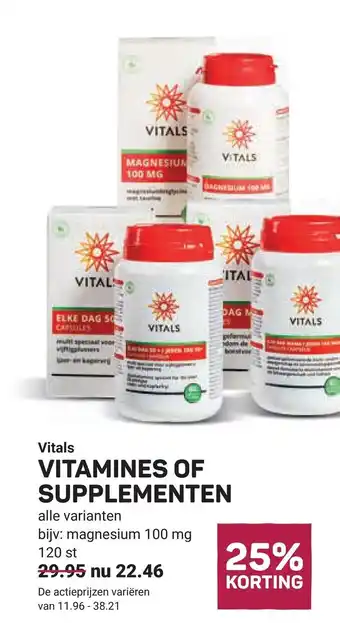 Ontdek de uitgebreide collectie Vitals vitamines en supplementen, waaronder magnesium 100 mg en multi speciaal voor dagelijks gebruik. Profiteer nu van 25% korting op alle varianten, zoals de Vitals ELKE DAG SC CAPSULES. Deze hoogwaardige producten zijn essentieel voor een gezonde levensstijl en ondersteunen diverse lichaamsfuncties. Of je nu op zoek bent naar een specifieke vitamine of een algemene multivitamine, Vitals heeft het allemaal. Met de actieprijzen van Vitals kun je voordelig investeren in je gezondheid en welzijn. Kies voor kwaliteit en bestel vandaag nog jouw favoriete Vitals vitamines en supplementen met 25% korting. Verwen jezelf met de beste voedingsstoffen en voel je vitaal en energiek!