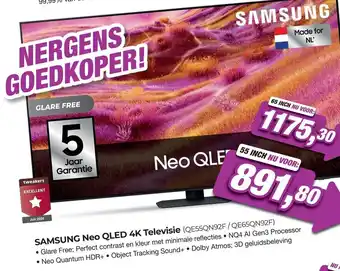 De Samsung Neo QLED 4K televisie biedt perfect contrast en kleur met minimale reflecties dankzij de Glare Free technologie. Met de NQ4 Al Gen3 Processor en Neo Quantum HDR+ geniet je van haarscherpe beelden en levendige kleuren. De Object Tracking Sound+ en Dolby Atmos zorgen voor een 3D geluidsbeleving die je volledig meesleept in de actie. Deze televisie is Made for NL en heeft een garantie tot juli 2025. Met een keuze uit 55 inch of 65 inch, is er voor elk interieur een passend formaat beschikbaar. Profiteer nu van de scherpe prijs van 891,80 euro voor de 55 inch en 1175,30 euro voor de 65 inch. NERGENS GOEDKOPER!