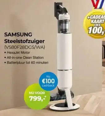 De Samsung Steelstofzuiger VS80F28DGS/WA is momenteel met korting verkrijgbaar bij EP Beerepoot. Hier vind je alle details over prijs, geldigheidsduur en actievoorwaarden. Vergeet niet om ook andere aanbiedingen en deals voor Samsung Steelstofzuiger VS80F28DGS/WA te bekijken zodat je zeker weet dat je de beste prijs betaalt. De kortingsactie loopt van 05-02-2026 tot 22-02-2026. Is de actie inmiddels verlopen? Geen zorgen, vergelijk dan soortgelijke aanbiedingen of volg de productcategorie voor toekomstige prijsverlagingen. Zo koop je altijd met voordeel.Veelgestelde vragen over Samsung Steelstofzuiger VS80F28DGS/WA