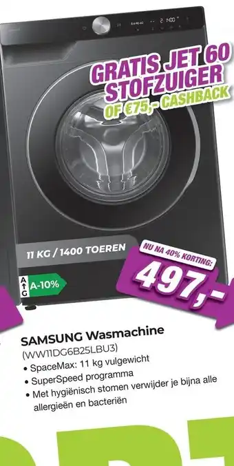 NU NA 40% KORTING: SAMSUNG Wasmachine (WW11DG6B25LBU3) met keuze uit GRATIS JET 60 STOFZUIGER OF €75 CASHBACK. Deze wasmachine heeft een vulgewicht van 11 kg en 1400 toeren per minuut. Met het SuperSpeed programma bespaar je tijd en energie. De SpaceMax technologie zorgt voor extra ruimte in de trommel. Daarnaast beschikt deze wasmachine over hygiënisch stomen om allergieën en bacteriën te verwijderen. Profiteer nu van de korting en ontvang een gratis stofzuiger of cashback. Upgrade je huishouden met deze Samsung wasmachine en geniet van schone en frisse kleding. Bestel hem nu voor slechts €497,- en maak gebruik van de extra aanbieding!