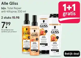 Etos biedt naast de Alle Gliss een ruime collectie producten aan. Houd de wekelijkse Etos folder in de gaten om de beste aanbiedingen en acties te vinden. Naast Alle Gliss, kunt u ook de volgende aanbiedingen vinden: Schwarzkopf Gliss, Schwarzkopf gliss kur gliss aqua revive shampoo 250ml & Schwarzkopf gliss kur gliss total repair shampoo 250ml.