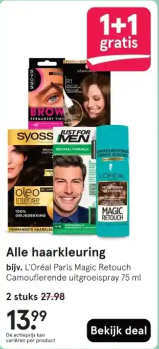 Profiteer nu van de actie '1+1 gratis' op alle haarkleuringen, zoals L'Oréal Paris Magic Retouch Camouflerende uitgroeispray. Met keuze uit diverse kleuren en formules, zoals permanent tint, intense, en grijsdekking. Of ga voor de Syoss MEN Original Formula voor een natuurlijke look. Of kies voor de Oleo Intense Hogenbrun Chatain voor een diepe, rijke kleur. Met de Magic Retouch spray kun je eenvoudig je uitgroei camoufleren. Alle producten zijn van topmerken zoals L'Oréal en Syoss. Mis deze kans niet en geef je haar de perfecte kleur die bij jou past. De actieprijs kan variëren per product, dus bekijk snel de deal en sla je slag!