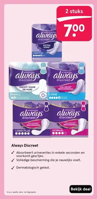 De aanbieding is verkrijgbaar in verschillende winkels, bekijk alle producten om de goedkoopste Always Discreet te krijgen. Als je graag wilt kijken of het artikel met meer korting te koop is in een andere winkel, bekijk de categorie 'Drogist en Parfumerie'. Wellicht vind je deze aanbiedingen ook interessant: Always Discreet, Always Discreet & Always Discreet.