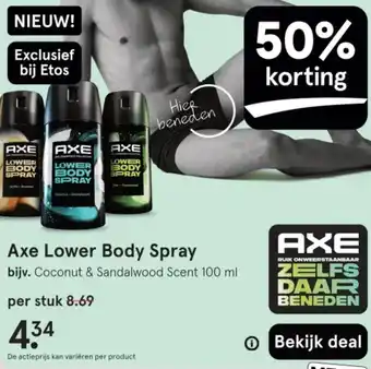 De prijs van de Axe Lower Body Spray kan ook teruggevonden worden hierboven op de pagina, samen met de datum van wanneer de aanbieding beschikbaar is. Ook kun je de prijzen in de huidige Etos folder of op de Etos website controleren. De aanbiedingen verzekeren je van het kopen van de Etos producten voor de laagste prijs.