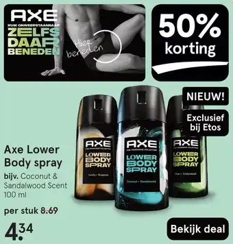 De prijs van de Axe Lower Body spray kan ook teruggevonden worden hierboven op de pagina, samen met de datum van wanneer de aanbieding beschikbaar is. Ook kun je de prijzen in de huidige Etos folder of op de Etos website controleren. De aanbiedingen verzekeren je van het kopen van de Etos producten voor de laagste prijs.