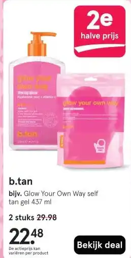 De aanbieding is verkrijgbaar in verschillende winkels, bekijk alle producten om de goedkoopste b.tan te krijgen. Als je graag wilt kijken of het artikel met meer korting te koop is in een andere winkel, bekijk de categorie 'Drogist en Parfumerie'. Wellicht vind je deze aanbiedingen ook interessant: B.tan Glow Your Own Way Self Tan Gel Mitt, B.tan Glow Your Own Way Self Tan Gel 437 ML & aanbieding 3.