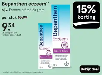 Bepanthen Eczeem Crème is een medisch hulpmiddel dat speciaal is ontwikkeld voor de behandeling van eczeem. De crème start jeukverlichting binnen 30 minuten en verlicht roodheid zonder cortisonen. Met Bepanthen Eczeem Crème kun je snel en effectief symptomen van eczeem aanpakken. De actieprijs kan variëren per product, maar je kunt nu profiteren van 15% korting. Bestel nu en start met het verlichten van je eczeemklachten. Let op: lees voor het kopen de verpakking voor gebruiksinstructies. Bepanthen Eczeem Crème is van het merk Bayer en wordt geleverd in een tube van 20 gram. Bekijk de deal en zorg voor verlichting van je eczeemklachten.