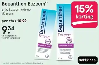 Start jeukverlichting binnen 30 minuten met Bepanthen Eczeem Crème. Dit medisch hulpmiddel verlicht roodheid zonder corticosteroïden. Per stuk slechts 10.99. De actieprijs kan variëren per product. Bekijk de deal en lees voor het kopen de verpakking voor meer informatie. Bepanthen Eczeem Crème is speciaal ontwikkeld om de symptomen van eczeem te verlichten en de huid te herstellen. Met de krachtige formule wordt de jeuk snel verminderd en de huidbarrière versterkt. De crème is geschikt voor de gevoelige huid en kan dagelijks worden gebruikt. Profiteer nu van 15% korting op Bepanthen Eczeem Crème en ervaar zelf de effectieve werking tegen eczeemklachten.
