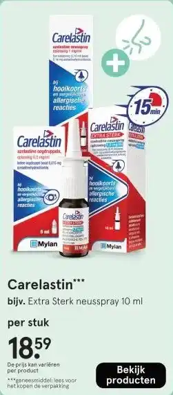 De aanbieding is verkrijgbaar in verschillende winkels, bekijk alle producten om de goedkoopste Carelastin te krijgen. Als je graag wilt kijken of het artikel met meer korting te koop is in een andere winkel, bekijk de categorie 'Drogist en Parfumerie'. Wellicht vind je deze aanbiedingen ook interessant: Carelastin, Carelastin & Carelastin Azelastine.