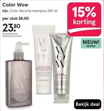 Etos biedt naast de Color Wow een ruime collectie producten aan. Houd de wekelijkse Etos folder in de gaten om de beste aanbiedingen en acties te vinden. Naast Color Wow, kunt u ook de volgende aanbiedingen vinden: Color Wow, Color Wow & Color wow color security shampoo 250ml.
