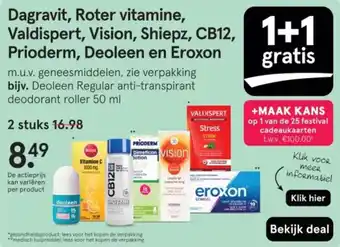 Koop Dagravit, Roter vitamine, Valdispert, Vision, Shiepz, CB12, Prioderm, Deoleen en Eroxon komende week met korting