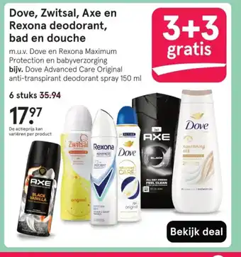 Dove, Zwitsal, Axe en Rexona deodorant, bad en douche 900 ml 3+3 gratis