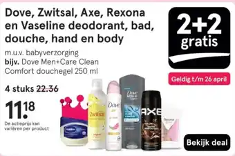 Profiteer nu van de geweldige actie op Dove, Zwitsal, Axe, Rexona en Vaseline deodorant, bad, douche, hand en body producten. Van Dove Men+Care Clean Comfort douchegel tot Zwitsal babyverzorging, er is voor ieder wat wils. Koop bijvoorbeeld 4 stuks Dove Men+Care Clean Comfort douchegel 250 ml voor slechts 22.36. De actieprijs kan variëren per product, dus wees er snel bij! Deze aanbieding is geldig t/m 26 april, dus wacht niet te lang. Bekijk nu de deal en geniet van de heerlijke geuren en verzorgende werking van Dove, Zwitsal, Axe, Rexona en Vaseline producten. Mis deze kans niet om jezelf of een ander te verwennen met topkwaliteit verzorgingsproducten!