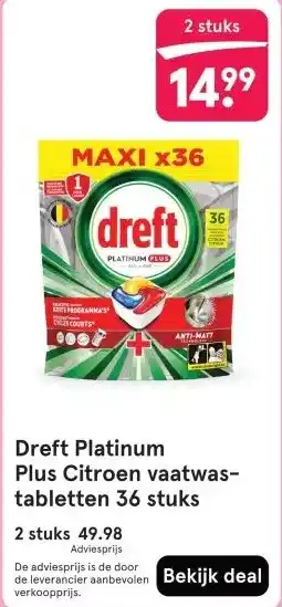 De Dreft Platinum Plus Citroen vaatwas- tabletten 36 stuks is momenteel met korting verkrijgbaar bij Etos. Hier vind je alle details over prijs, geldigheidsduur en actievoorwaarden. Vergeet niet om ook andere aanbiedingen en deals voor Dreft Platinum Plus Citroen vaatwas- tabletten 36 stuks te bekijken zodat je zeker weet dat je de beste prijs betaalt. De kortingsactie loopt van 09-03-2026 tot 15-03-2026. Is de actie inmiddels verlopen? Geen zorgen, vergelijk dan soortgelijke aanbiedingen of volg de productcategorie voor toekomstige prijsverlagingen. Zo koop je altijd met voordeel.Veelgestelde vragen over Dreft Platinum Plus Citroen vaatwas- tabletten 36 stuks