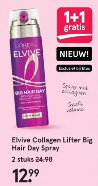 Ontdek de nieuwste toevoeging aan de Elvive lijn van L'ORÉAL PARIS: de Collagen Lifter Big Hair Day Spray. Speciaal ontwikkeld voor dun en plat haar, deze spray met collageen geeft je haar een volume boost en zorgt voor een verfrissende look. Exclusief verkrijgbaar bij Etos, profiteer nu van de 1+1 gratis actie en ontvang 2 stuks voor slechts 12.99. Met de Collagen Lifter Big Hair Day Spray creëer je eenvoudig een volumineuze coupe die de hele dag blijft zitten. Geef je haar de verzorging die het verdient en geniet van prachtig volumineus haar met de Elvive Collagen Lifter Big Hair Day Spray.