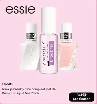 Maak je nagelroutine compleet met de Essie Gel Couture collectie. Met de Break Fix Liquid Nail Patch zorg je voor sterke en gezonde nagels. Essie staat bekend om haar hoogwaardige nagelproducten en trendy kleuren. Kies uit een breed assortiment aan nagellakken en verzorgingsproducten om jouw nagels te laten stralen. Met de Essie Gel Couture nagellak geniet je van een langdurige glans en een professionele uitstraling. De Break Fix Liquid Nail Patch repareert beschadigde nagels en zorgt voor een egale basis voor je nagellak. Bekijk nu de Essie producten en geef je nagels de verzorging die ze verdienen. Essie, stap voor stap naar prachtige nagels!