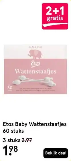 De prijs van de Etos Baby Wattenstaafjes 60 stuks kan ook teruggevonden worden hierboven op de pagina, samen met de datum van wanneer de aanbieding beschikbaar is. Ook kun je de prijzen in de huidige Etos folder of op de Etos website controleren. De aanbiedingen verzekeren je van het kopen van de Etos producten voor de laagste prijs.