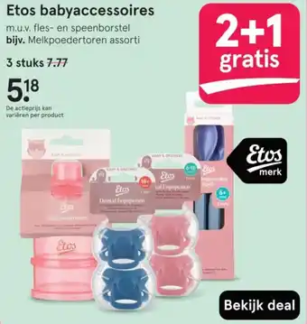 De prijs van de Etos babyaccessoires kan ook teruggevonden worden hierboven op de pagina, samen met de datum van wanneer de aanbieding beschikbaar is. Ook kun je de prijzen in de huidige Etos folder of op de Etos website controleren. De aanbiedingen verzekeren je van het kopen van de Etos producten voor de laagste prijs.