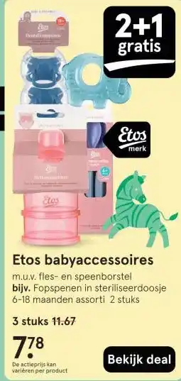 De prijs van de Etos babyaccessoires kan ook teruggevonden worden hierboven op de pagina, samen met de datum van wanneer de aanbieding beschikbaar is. Ook kun je de prijzen in de huidige Etos folder of op de Etos website controleren. De aanbiedingen verzekeren je van het kopen van de Etos producten voor de laagste prijs.