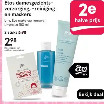 De prijs van de Etos damesgezichts- verzorging, -reiniging en maskers kan ook teruggevonden worden hierboven op de pagina, samen met de datum van wanneer de aanbieding beschikbaar is. Ook kun je de prijzen in de huidige Etos folder of op de Etos website controleren. De aanbiedingen verzekeren je van het kopen van de Etos producten voor de laagste prijs.