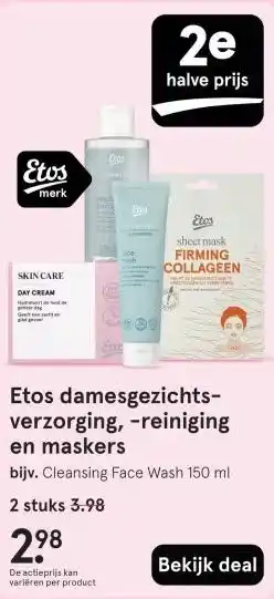 De prijs van de Etos damesgezichts- verzorging, -reiniging en maskers kan ook teruggevonden worden hierboven op de pagina, samen met de datum van wanneer de aanbieding beschikbaar is. Ook kun je de prijzen in de huidige Etos folder of op de Etos website controleren. De aanbiedingen verzekeren je van het kopen van de Etos producten voor de laagste prijs.