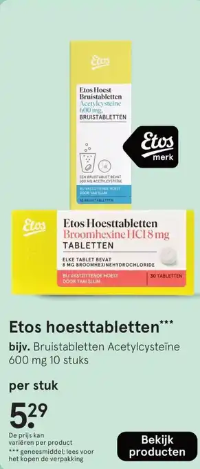 De prijs van de Etos hoesttabletten kan ook teruggevonden worden hierboven op de pagina, samen met de datum van wanneer de aanbieding beschikbaar is. Ook kun je de prijzen in de huidige Etos folder of op de Etos website controleren. De aanbiedingen verzekeren je van het kopen van de Etos producten voor de laagste prijs.