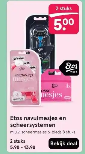 De Etos navulmesjes en scheersystemen is momenteel met korting verkrijgbaar bij Etos. Hier vind je alle details over prijs, geldigheidsduur en actievoorwaarden. Vergeet niet om ook andere aanbiedingen en deals voor Etos navulmesjes en scheersystemen te bekijken zodat je zeker weet dat je de beste prijs betaalt. De kortingsactie loopt van 19-01-2026 tot 25-01-2026. Is de actie inmiddels verlopen? Geen zorgen, vergelijk dan soortgelijke aanbiedingen of volg de productcategorie voor toekomstige prijsverlagingen. Zo koop je altijd met voordeel.Veelgestelde vragen over Etos navulmesjes en scheersystemen
