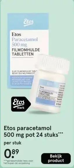 De prijs van de Etos paracetamol 500 mg pot 24 stuks kan ook teruggevonden worden hierboven op de pagina, samen met de datum van wanneer de aanbieding beschikbaar is. Ook kun je de prijzen in de huidige Etos folder of op de Etos website controleren. De aanbiedingen verzekeren je van het kopen van de Etos producten voor de laagste prijs.