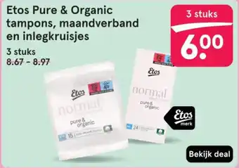 Etos Pure & Organic tampons, maandverband en inlegkruisjes aanbieding bij Etos
