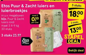 De prijs van de Etos Puur & Zacht lui luierbroekjes ers en kan ook teruggevonden worden hierboven op de pagina, samen met de datum van wanneer de aanbieding beschikbaar is. Ook kun je de prijzen in de huidige Etos folder of op de Etos website controleren. De aanbiedingen verzekeren je van het kopen van de Etos producten voor de laagste prijs.