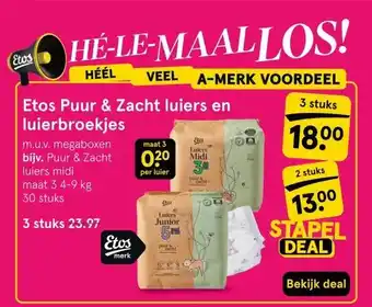 Etos biedt naast de Etos Puur & Zacht luiers en luierbroekjes een ruime collectie producten aan. Houd de wekelijkse Etos folder in de gaten om de beste aanbiedingen en acties te vinden. Naast Etos Puur & Zacht luiers en luierbroekjes, kunt u ook de volgende aanbiedingen vinden: Etos puur & zacht luiers en luierbroekjes megaboxen, Etos Puur & Zacht lui luierbroekjes ers en & Etos Puur & Zacht Luiers Maat 3 Midi 4-9 kg 90 stuks.