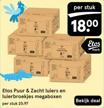 Deze Etos Puur & Zacht luiers en luierbroekjes megaboxen is nu in de aanbieding bij Etos. Op deze pagina vind je alle informatie over actuele prijzen, actievoorwaarden en looptijd. Vergelijk ook andere relevante aanbiedingen en acties rondom Etos Puur & Zacht luiers en luierbroekjes megaboxen, zodat je altijd de slimste keuze maakt. De aanbieding loopt van 20-04-2026 tot en met 26-04-2026. Is de actie verlopen? Geen probleem – vergelijkbare deals vind je altijd via deze pagina. Volg eventueel de productcategorie om automatisch op de hoogte te blijven van nieuwe aanbiedingen of prijsdalingen voor Etos Puur & Zacht luiers en luierbroekjes megaboxen.Veelgestelde vragen over Etos Puur & Zacht luiers en luierbroekjes megaboxen