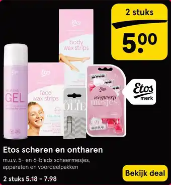 Bekijk de meest recente aanbiedingen en blijf op de hoogte van welke winkels Etos scheren en ontharen op korte termijn met korting aanbieden. Niemand betaalt graag te veel – daarom houden wij de prijzen scherp in de gaten. Pas je (boodschappen)lijst aan op basis van acties van deze week én verwachte deals. Sommige aanbiedingen gelden alleen in de winkel, dus check regelmatig waar Etos scheren en ontharen het voordeligst verkrijgbaar is.Veelgestelde vragen over Etos scheren en ontharen