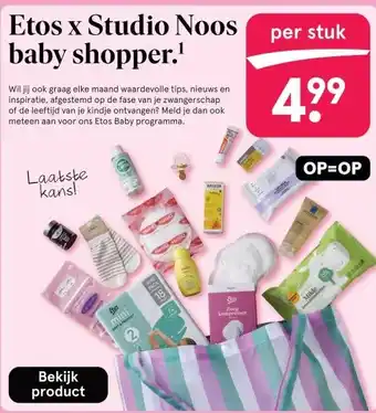 De prijs van de Etos x Studio Noos baby shopper.¹ kan ook teruggevonden worden hierboven op de pagina, samen met de datum van wanneer de aanbieding beschikbaar is. Ook kun je de prijzen in de huidige Etos folder of op de Etos website controleren. De aanbiedingen verzekeren je van het kopen van de Etos producten voor de laagste prijs.
