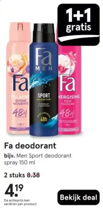 De aanbieding is verkrijgbaar in verschillende winkels, bekijk alle producten om de goedkoopste Fa deodorant te krijgen. Als je graag wilt kijken of het artikel met meer korting te koop is in een andere winkel, bekijk de categorie 'Drogist en Parfumerie'. Wellicht vind je deze aanbiedingen ook interessant: Fa deodorant, Fa Deodorant en Douche & Fa deodorant en douche.