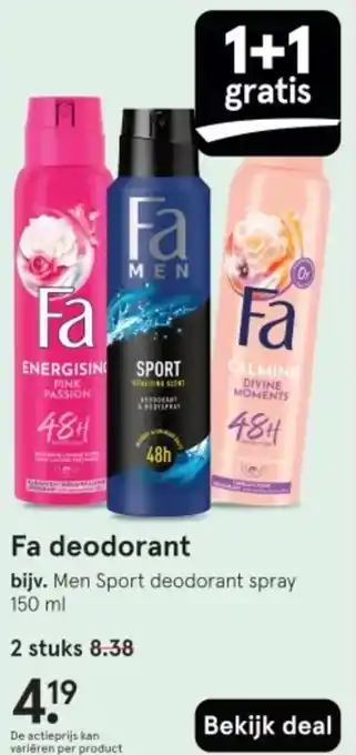 De Fa deodorant is momenteel met korting verkrijgbaar bij Etos. Hier vind je alle details over prijs, geldigheidsduur en actievoorwaarden. Vergeet niet om ook andere aanbiedingen en deals voor Fa deodorant te bekijken zodat je zeker weet dat je de beste prijs betaalt. De kortingsactie loopt van 20-04-2026 tot 26-04-2026. Is de actie inmiddels verlopen? Geen zorgen, vergelijk dan soortgelijke aanbiedingen of volg de productcategorie voor toekomstige prijsverlagingen. Zo koop je altijd met voordeel.Veelgestelde vragen over Fa deodorant