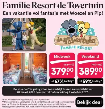 Geniet van een magische vakantie vol fantasie met Woezel en Pip in Familie Resort de Tovertuin. Verblijf een midweek (ma-vrij) of weekend (vrij-ma) met tot 67% korting. De voucher is geldig voor een verblijf tussen aankomstdatum 20 maart 2026 t/m vertrekdatum vrijdag 9 oktober 2026. Verzilver de voucher t/m 3 april 2026 op basis van beschikbaarheid voor de Etos actie. Ontsnap aan de drukte en ontspan in de Tovertuin met het hele gezin. Profiteer van de speciale aanbieding en maak herinneringen die een leven lang meegaan. De voucher is niet geldig voor een verblijf tijdens feestdagen en vakanties. Kijk voor alle voorwaarden op etos.nl/vouchers. Bekijk deal.