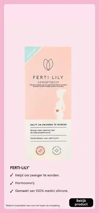 De aanbieding is verkrijgbaar in verschillende winkels, bekijk alle producten om de goedkoopste FERTI-LILY te krijgen. Als je graag wilt kijken of het artikel met meer korting te koop is in een andere winkel, bekijk de categorie 'Drogist en Parfumerie'. Wellicht vind je deze aanbiedingen ook interessant: FERTI-LILY, Ferti-Lily Conceptiecup - 1 herbruikbare cup & Servies Lily.