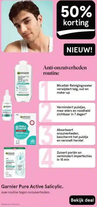 Ontdek de nieuwe toevoeging aan jouw routine tegen onzuiverheden met GARNIER Pure Active Salicylic. Dit Micellair Reinigingswater verwijdert talg, vuil en make-up, terwijl het de poriën zuivert en imperfecties vermindert in slechts 15 minuten. Het Anti-onzuiverheden ANTI-IMPERFECTION SCRUB MASK absorbeert onzuiverheden, beschermt het puistje en versnelt het herstel. Met 8 PIMPLE PATCH ULTRA x22 PATCHES verminder je puistjes, mee-eters en roodheid zichtbaar in 7 dagen*. Profiteer nu van 50% korting op dit revolutionaire product van GARNIER SALICYLIQUE. Klinisch getest op 37 personen. Bekijk de deal en geef je huid de verzorging die het verdient.