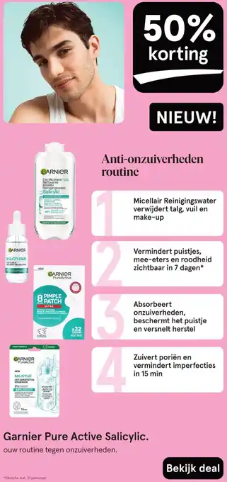 Ontdek de nieuwe toevoeging aan jouw routine tegen onzuiverheden met Garnier Pure Active Salicylic. Dit Micellair Reinigingswater verwijdert talg, vuil en make-up, terwijl het Anti-onzuiverheden Serum Mask puistjes, mee-eters en roodheid zichtbaar vermindert in 7 dagen. De Ultra Anti-Imperfection Patches zijn klinisch bewezen om grote, volwassen puistjes in slechts 8 uur te verminderen. De Vegan Formula is geïnfundeerd met 3% Salicylic Acid om poriën te zuiveren en imperfecties te verminderen in slechts 15 minuten. Profiteer nu van 50% korting op jouw eerste aankoop van Garnier Pure Active Salicylic en ervaar zelf de effectiviteit van dit revolutionaire product. Klinische test uitgevoerd op 37 personen. Bekijk de deal nu!