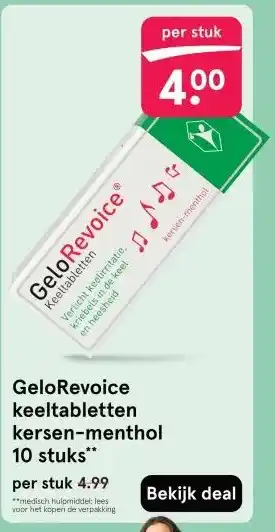 Deze GeloRevoice keeltabletten kersen-menthol 10 stuks is nu in de aanbieding bij Etos. Op deze pagina vind je alle informatie over actuele prijzen, actievoorwaarden en looptijd. Vergelijk ook andere relevante aanbiedingen en acties rondom GeloRevoice keeltabletten kersen-menthol 10 stuks, zodat je altijd de slimste keuze maakt. De aanbieding loopt van 29-12-2025 tot en met 04-01-2026. Is de actie verlopen? Geen probleem – vergelijkbare deals vind je altijd via deze pagina. Volg eventueel de productcategorie om automatisch op de hoogte te blijven van nieuwe aanbiedingen of prijsdalingen voor GeloRevoice keeltabletten kersen-menthol 10 stuks.Veelgestelde vragen over GeloRevoice keeltabletten kersen-menthol 10 stuks