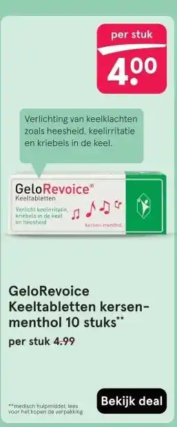 Deze GeloRevoice Keeltabletten kersen- menthol 10 stuks is nu in de aanbieding bij Etos. Bekijk ook andere lopende acties en bespaar met scherpe prijzen of online deals. Bestel GeloRevoice Keeltabletten kersen- menthol 10 stuks via Etos website of koop het product met korting in een winkel bij jou in de buurt. Op Folderz.nl verzamelen we dagelijks de beste GeloRevoice Keeltabletten kersen- menthol 10 stuks aanbiedingen. Klik op het belletje om een gratis melding te ontvangen zodra er weer een nieuwe actie of prijsverlaging voor GeloRevoice Keeltabletten kersen- menthol 10 stuks beschikbaar is.Veelgestelde vragen over GeloRevoice Keeltabletten kersen- menthol 10 stuks