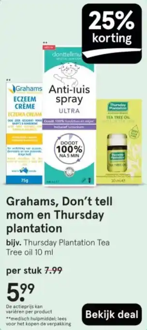 De aanbieding is verkrijgbaar in verschillende winkels, bekijk alle producten om de goedkoopste Grahams, Don't tell mom en Thursday plantation te krijgen. Als je graag wilt kijken of het artikel met meer korting te koop is in een andere winkel, bekijk de categorie 'Drogist en Parfumerie'. Wellicht vind je deze aanbiedingen ook interessant: Thursday plantation tea tree olie 10ml, Thursday plantation tea tree olie 100% natuurlijk 25ml & Naif Mom Body Oil.