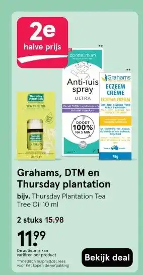 De aanbieding is verkrijgbaar in verschillende winkels, bekijk alle producten om de goedkoopste Grahams, DTM en Thursday plantation te krijgen. Als je graag wilt kijken of het artikel met meer korting te koop is in een andere winkel, bekijk de categorie 'Drogist en Parfumerie'. Wellicht vind je deze aanbiedingen ook interessant: Thursday Plantation Tea Tree Olie - 25ml, Thursday Plantation Tea Tree Olie - 10ml & Thursday plantation tea tree olie 10ml.