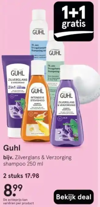 Verwen je haar met de Guhl Zilverglans & Verzorging shampoo, nu verkrijgbaar in een 1+1 gratis actie. Deze shampoo zorgt voor intensieve stevigheid en geeft je haar een prachtige zilverglans. De formule is speciaal ontwikkeld voor droog en beschadigd haar, en zorgt voor een diepe hydratatie en verzorging. Met de 2-in-1 formule reinig je je haar grondig en geef je het tegelijkertijd een boost van glans en stevigheid. Profiteer nu van deze geweldige deal en geef je haar de verzorging die het verdient. De actieprijs van 2 stuks is slechts 17.98, dus slechts 8.99 per stuk. Bekijk de deal en geniet van prachtig glanzend en verzorgd haar!