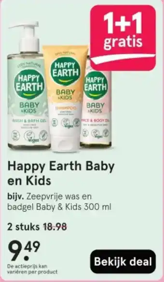 Met de Happy Earth Baby en Kids actie krijg je nu 1+1 gratis op de zeepvrije was en badgel voor baby's en kinderen. De HAPPY EARTH BABY KIDS SHAMPOO is speciaal ontwikkeld voor de gevoelige huid van de kleintjes. De milde formule reinigt en verzorgt op een zachte manier, zonder de huid uit te drogen. De Happy Earth Baby en Kids producten zijn gemaakt van natuurlijke ingrediënten en zijn vrij van schadelijke stoffen. Profiteer nu van deze aanbieding en geef de beste verzorging aan de huid van jouw kinderen. De actieprijs kan variëren per product, dus bekijk snel de deal en zorg dat je de zeepvrije was en badgel in huis haalt voor een zachte en gezonde huid.