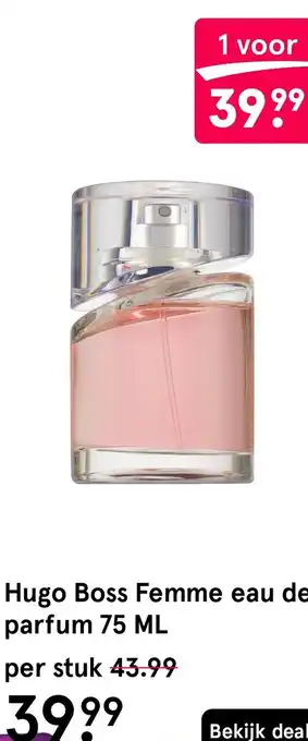 De aanbieding is verkrijgbaar in verschillende winkels, bekijk alle producten om de goedkoopste Hugo Boss Femme eau de parfum te krijgen. Als je graag wilt kijken of het artikel met meer korting te koop is in een andere winkel, bekijk de categorie 'Drogist en Parfumerie'. Wellicht vind je deze aanbiedingen ook interessant: Hugo boss femme eau de parfum 75ml, Hugo Boss Femme & Hugo Boss Femme.