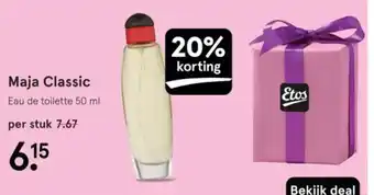 Etos biedt naast de Maja Classic een ruime collectie producten aan. Houd de wekelijkse Etos folder in de gaten om de beste aanbiedingen en acties te vinden. Naast Maja Classic, kunt u ook de volgende aanbiedingen vinden: Maja Soap, Maja Talkpoeder & Maja eau de toilette 100ml.